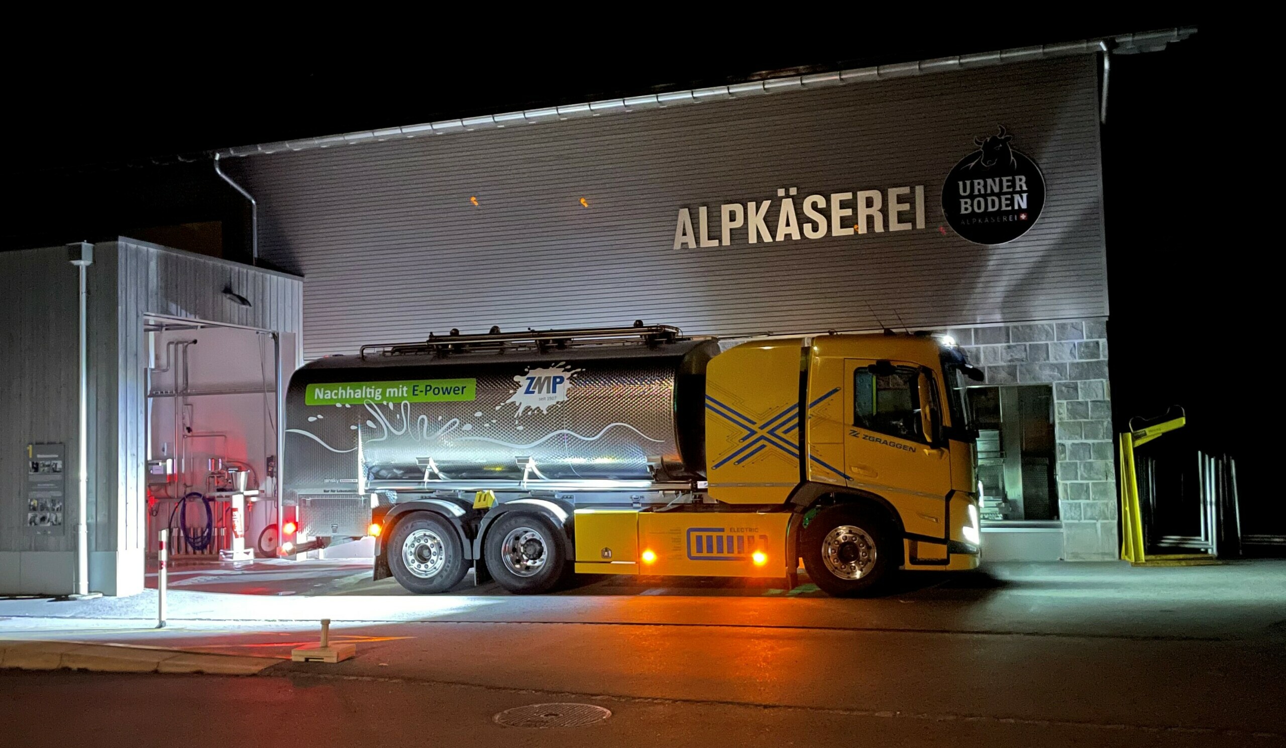 Zgraggen and Designwerk put the first all-electric milk collection vehicle on the road Zgraggen and Designwerk put the first all-electric milk collection vehicle on the roadAugust 21, 2023 – Designwerk delivers the first all-electric milk collection vehicle to Zgraggen Transport. Thanks to the electric truck for milk collection, around 93 t of CO2 can be saved annually, making milk collection in the canton of Uri locally emission-free. The two companies are making sure that another application is climate-friendly. Recently, there has been a novelty on Swiss roads – an all-electric milk collection vehicle. The vehicle comes from Winterthur-based electromobility specialist Designwerk Technologies AG. The MID CAB tanker 6x2R 510E is used by Zgraggen Transport AG for milk collection in the canton of Uri. “By using the first electric milk collector in Switzerland, we are setting an example. This allows us to operate locally without emissions and make an important contribution to low-emission mobility,” says Elias Zgraggen, Managing Director of Zgraggen Transport. By not using diesel, Zgraggen can save around 93 t of CO2 per year. The technical details of the e-milk cart are unique on the market to date. The lightweight, fixed-tooth drive train comes into its own in a weight-critical application such as milk collection. With 510 kilowatt hours of battery capacity, the vehicle offers a range of between 250 and 300 kilometers. The complete superstructure is also electrically powered. Thus, the entire operation runs locally emission-free and barely audible. The continuously variable 1-speed transmission, in conjunction with the recuperation pedal, which is also continuously variable, allows easy handling and efficient and sensitive maneuvering in both urban and alpine environments. Another special application in the commercial vehicle sector finds its way onto the road The all-electric milk collector has been in operation for a few weeks and covers a distance of around 330 kilometers every day, which always ends with the return journey from the milk collection station at the Emmi company in Dagmersellen or Emmen. This corresponds to an annual performance of approximately 120,000 kilometers. This is the third e-truck from Designwerk that Zgraggen Transport has put into operation, in addition to the two existing HIGH CAB Semi 6x2T semitrailers, each with 900 kWh battery capacity. The vehicles can be recharged directly at the company site in Schattdorf after their missions. The company produces the electricity for the battery-powered vehicles itself with its own solar power and wood gasification plant. With the commissioning of the electric milk collection vehicle, the two companies are ensuring locally emission-free journeys in another special application. The flexibility in the placement of the high-voltage batteries in Designwerk vehicles guarantees many more applications of this type. Miriam Bosshard2025-02-19T10:46:42+01:00